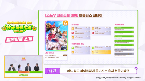이번 방송에는 오는 20일 진행될 예정인 업데이트에 대한 내용이 공개됐다. 먼저 신규 스토리 이벤트인 ‘성스러운 밤에 더해지는 기적’이 진행되고, 새로운 서포트 카드인 [스노우 크리스털 데이] 마블러스 선데이가 등장한다.