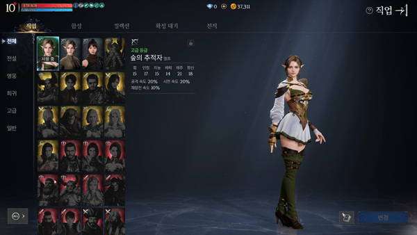 엘프 '추적자'(궁수)를 육성하면서 2개의 전직을 얻을 수 있었다. 전직을 하면 외형이 조금 화려해지고 능력치도 올라간다. 본 기자는 희귀 전직까지 얻었는데, 여기까지만 해도 게임 플레이를 원활하게 할 수 있었다. 다만, 전설 전직까지 얻기 위해서는 게임을 정말 오래 하거나 과금을 해야 할 것으로 보인다.