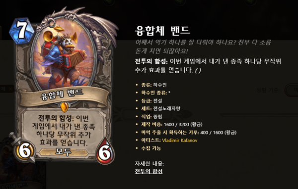 레오 로블스 곤잘레스 게임 디자이너: 하나 더 꼽자면, ‘융합체 밴드’라는 카드가 있다. 나는 덱 빌딩을 잘 하는 편이 아니다. 그래서 다양한 종류의 하수인을 조합했을 때, 좋은 시너지를 낼 수 있는 카드를 만들어봤다. 유저들이 이 카드를 어떻게 활용할지 기대된다.