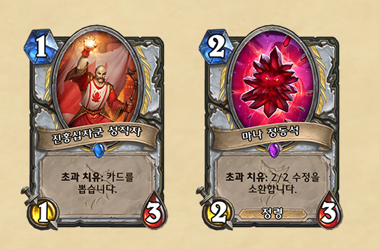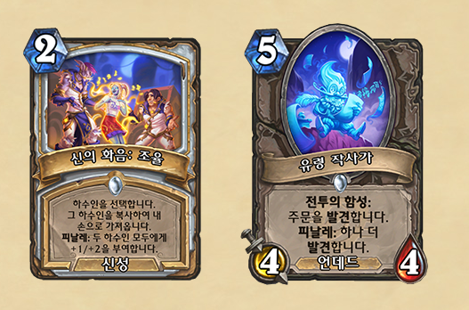 알레코 포어스 게임 디자이너: 맞다. 그런 것도 우리의 목표 중 하나다. 기존 카드를 개편해서 사제의 다양한 모습을 구현하고 싶었다. 동시에 사제의 게임 플레이를 더 재미있게 만들고 싶었다. 사제의 정체성은 ‘치유’다. 그런데 다른 능력에 비해서 ‘치유’라는 매커니즘은 다소 약하게 보일 때가 있다. 그래서 이번에는 ‘초과 치유’로 치유라는 능력을 기존보다 강력하게 만들었다. 전체적으로는 사제라는 직업의 암흑 속성을 더 강화하고 싶었다. 사냥꾼이 강력한 야수를 사용하듯이, 사제는 강력한 언데드 하수인을 사용하는 식으로 만들었다.