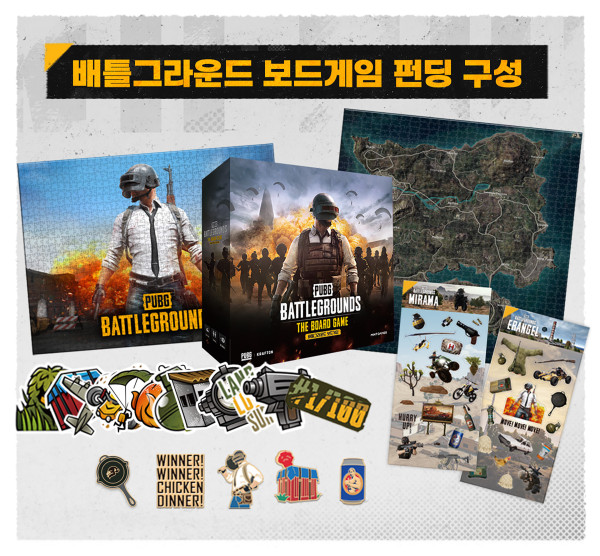 배틀그라운드 보드게임의 제작은 ‘와디즈’ 펀딩을 통해 진행된다. 3월 27일 오후 5시에 펀딩 페이지가 사전 오픈 되었으며, 오는 4월 13일에 본 펀딩이 열린다. 보드 게임 외에도 배틀그라운드 포스터, ‘에란겔’ 맵의 1,000피스 직소 퍼즐, 스티커, 메탈 배지 등도 함께 펀딩할 수 있다. 또, 펀딩 달성율에 따라 추가 캐릭터 피규어, 장비 스킨 카드, 혼자서도 게임을 즐길 수 있는 1인 모드 세트 등이 추가로 제공될 예정이다.