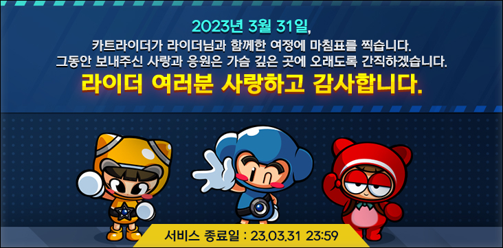 넥슨의 대표 캐주얼 레이싱 게임으로 자리잡은 ‘카트라이더’가 31일 오후 11시 59분을 기해 서비스를 종료하며 여정에 마침표를 찍는다.