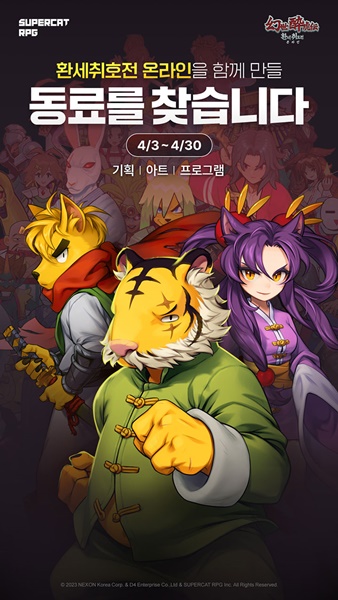 슈퍼캣의 역할수행게임(RPG) 전문 개발 자회사 ‘슈퍼캣RPG(대표 김영을)’는 신작 '환세취호전 온라인'을 개발 중인 ‘환세 스튜디오’에서 4월 한 달간 대규모 집중 채용을 진행한다고 3일 밝혔다.