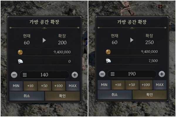 가방은 최대 250칸까지 확장이 가능하다. 이 중 골드로 늘릴 수 있는 범위는 200칸까지이며, 총 940만 골드가 쓰인다. 서비스 초기인 지금은 골드가 귀중한 자원이므로 적정한 수준을 골라서 늘리기를 추천한다. 고급 등급의 아키룬을 구입해야 하므로, 이를 염두에 두고 적정선을 결정하자. 참고로 201칸 확장부터 다이아가 투입되니 소모 재화를 꼭 확인하자. 전투 옵션 획득에서 장비 파편 획득 등급을 고급 이상으로 설정하는 것도 가방 관리에 도움이 된다.