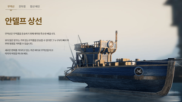 해상 콘텐츠 중에서 무역을 하기 위해서는 무역선이 필요하다. 바다에서 전투할 때 사용되는 배는 무역에 사용할 수 없다. 모든 유저들에게 지급되는 배는 무역선이 아니기에, 무역선은 별도로 제작해야 한다. 무역선을 제작하기 위해서는 우선 ‘무역선 건조대’부터 확보해야 한다. ‘무역선 건조대’를 얻으면, ‘함선’ 메뉴에서 무역선이 활성화된다.