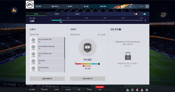 서포터들의 숫자가 많아지면 ‘집중 훈련’을 이용할 수 있게 된다. 원하는 선수의 세부적인 능력치를 올려주는 요소다. 최대 3개의 능력치를 최대 2씩 올릴 수 있다. 능력치를 올리는 데에 소모되는 재화가 많기 때문에 게임을 장기적으로 즐겨야 이용이 가능하다. 개발팀은 “너무 많은 능력치 상승이 제공될 경우, 각 선수가 갖고 있는 특성이 훼손되어 선수 간 차별성이 없어질 수도 있기 때문에 훈련 가능한 능력치 종류 및 상승량은 제한되어 있다”라고 전했다.