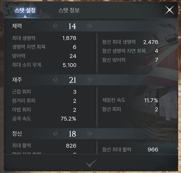 정신을 찍으면 최대 활력, 활력 자연 회복, 기술 저항이 오르고 기술 공격력이 증폭된다. (기술 저항이란 기술과 마법을 맞았을 때 ‘빗나감’이 뜨는 확률이다.) 만약 사냥에서 활력이 부족한 경우라면 정신을 올려주는 것이 좋다. 재주를 찍으면 근접 회피, 원거리 회피, 마법 회피, 공격 속도가 오른다. 올려주는 능력치는 모두 좋지만, 문제는 효율이다. 재주를 찍을 때 회피 관련 능력치가 오르는 효율은 좋지 않다.
