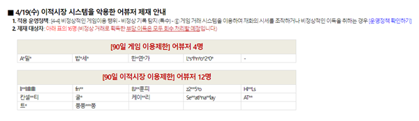 여론이 이렇게 조성되자, 넥슨도 칼을 들었다. ‘피파온라인4’ 운영진은 지난 19일에 ‘차익거래’를 반복적으로 수행해서 BP를 옮긴 유저들을 제재했다고 밝혔다. 제재를 당한 사람은 총 16명이다. 4명은 ‘90일 게임 이용 제한’ 제재를 받았고, 12명은 ‘90일 이적시장 이용 제한’ 제재를 받았다. 제재의 근거는 ‘피파온라인4’ 운영정책에 있는 ‘비정상적인 게임 이용 행위’ 관련 조항에 규정된, ‘게임 거래 시스템을 이용하여 재화의 시세를 조작하거나 비정상적인 이득을 취하는 경우’다.