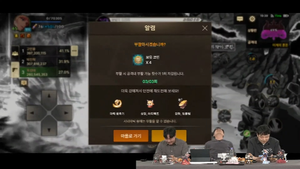 공략 자체는 무난하게 진행됐다. 평균 공격력이 낮아 저지에 시간을 썼지만, 클리어 자체는 무난하게 진행됐다. 진행 과정에서 옥성태 디렉터의 여런처가 몇 번 쓰러지는 사고가 발생하기도 했다. 그는 실력을 보여줄 기회를 놓쳤다며 짙은 아쉬움을 토로해 웃음을 자아냈다.