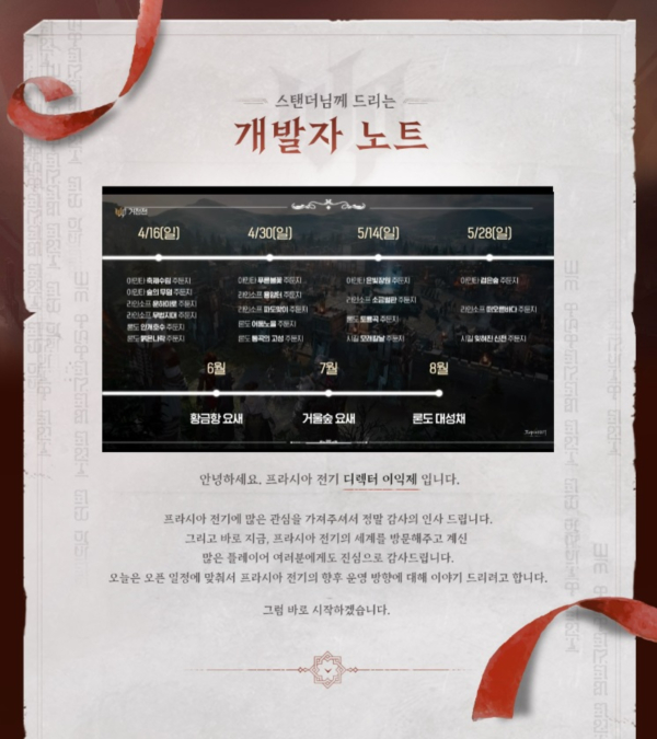 론칭 직후 ‘디렉터스 웰컴 메시지’를 통해 24년까지의 전반적인 업데이트 계획을 미리 안내했으며, 세부적인 콘텐츠 업데이트 내용을 담은 개발자 노트를 꾸준히 게시하며 플레이어들과 함께 만들어가는 ‘프라시아 전기’를 선보이고 있다.