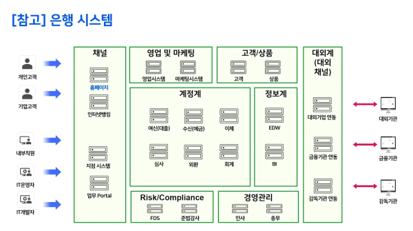 금융 클라우드 프로젝트 진행을 위해서는 금융 시스템의 깊은 이해가 필요하다. 금융 시스템은 구조적으로 되어 있고 각 구조는 다 연계되어 있다. 그래서 개인고객-기업고객-내부직원-운영자-개발자가 접속한 채널 시스템과 영업 및 마케팅 시스템, 가간계라 불리는 계산기 시스템, 정보분석계 시스템, 대외계 시스템 등으로 연결이 되어 있다. 업무에 따라 내용들이 바뀌지만 보험사와 증권사 시스템도 비슷하다.