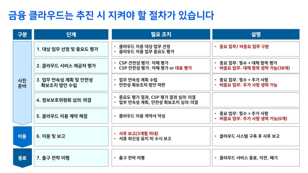 금융 클라우드는 추진 시 지켜야 절차가 있다. 처음에 어떤 대상 업무를 클라우드 서비스로 할 것인지 선정하고, 그 대상 업무에 대해 중요도를 평가한다. 그 다음 클라우드 서비스 제공자에 대한 평가를 하고, 대상 업무에 대해 연속성 계획과 안정성 확보 조치 방안을 수립한 내용들을 정보보호위원회의 심의 의결을 받는다. 이후 계약을 체결하고 서비스를 진행하며 보고도 진행한다.