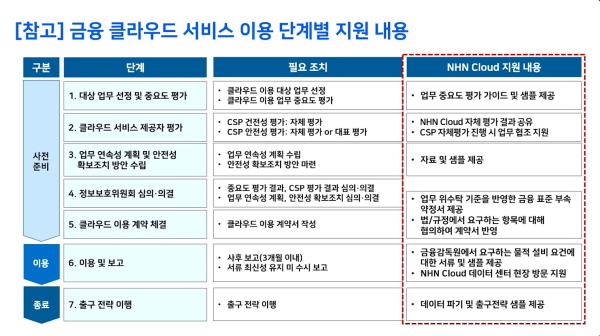 금융 클라우드를 추진하려면 비즈니스 관점과 IT 시스템 관점, 운영 관점 등 여러가지를 고려해야 한다. 그런 면에서 NHN 클라우드는 다양한 서비스를 지원하고 있다. 먼저 중소 핀테크 기업에 연 3600~9600만원 상당의 클라우드 비용을 지원하는 핀테크 지원센터 클라우드 지원 사업에 무료 컨설팅을 제공하고 있다.