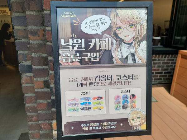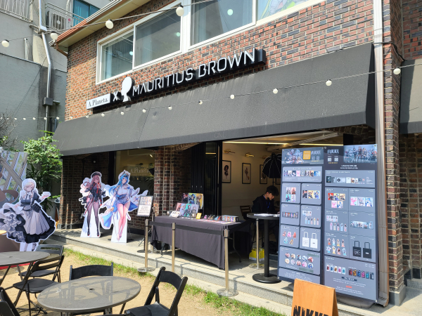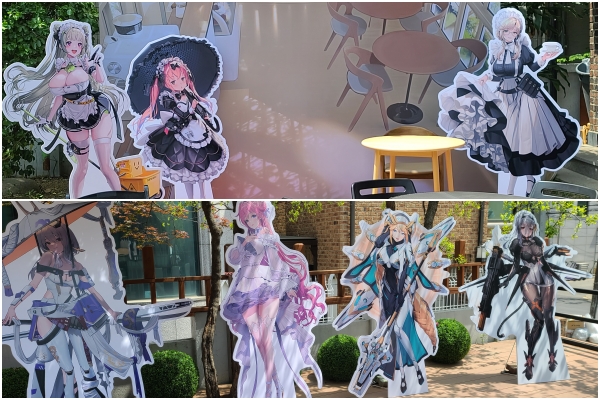 카페 앞은 '니케'에 등장하는 다양한 캐릭터들의 등신대가 마련되어 함께 사진을 찍을 수 있는 포토존으로 운영되고 있다.