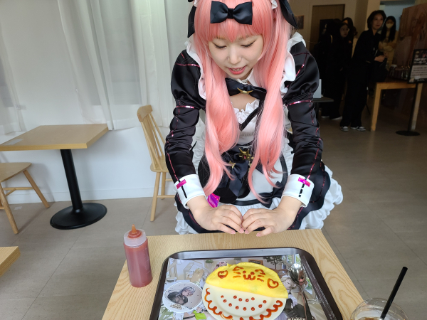쟁반에는 메이드 카페 캐릭터가 인쇄된 종이가 깔리고, 그 위에 주문한 음식이 세팅된다. 그리고 이 음식을 들고 2층에 마련된 메이드 카페로 올라가면 이번 테마 카페의 핵심인 세 명의 캐릭터를 만나볼 수 있다.