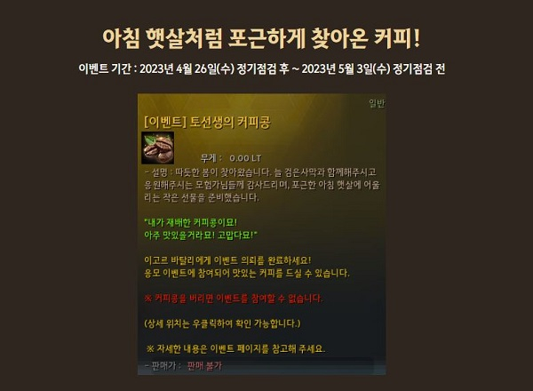펄어비스는 자사가 개발 및 서비스하는 PC MMORPG '검은사막'에서 지난 26일 게임 내 업데이트를 진행하며 행사 하나를 시작했다. 이름 하여 '햇살처럼 찾아온 토선생의 커피콩’이다.