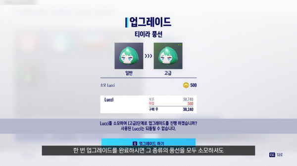 예를 들어 등급이 올라가면 방어에 더해 스피드전에서 자동 게이지 충선 속도가 올라가는 효과가 주어지는 것이다. 업그레이드는 확정적으로 가능하고 획득한 풍선은 루찌로 충전하며 계속 사용할 수 있다. 풍선은 레이스 한 번 당 하나씩 소모된다.