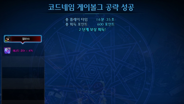 명성 4.1만인 엘레멘탈 바머 캐릭터로 2단계를 클리어했을 때 걸린 시간은 약 16분 35초다. 패턴에 익숙해진다면 10분에서 13분 내외로 단축이 가능해 보인다. 보상으로 얻는 에너지 코어는 약 475개였다.