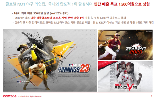 1분기 게임 매출에서 해외 매출 비중은 77%로 증가했다. ‘서머너즈 워’의 전 세계적인 흥행과 ‘서머너즈 워: 크로니클’ 글로벌 버전이 좋은 성과를 거둔 덕분이다. 여기에 야구 게임도 미국에서 좋은 성과를 거뒀다. 특히 2023년에는 야구 게임 신작 ‘MLB 9이닝스 라이벌’이 출시된다. 컴투스는 야구 게임 연간 매출 목표 1,500억 원을 무난하게 돌파할 것으로 전망하고 있다.