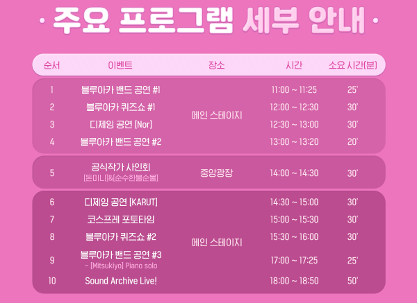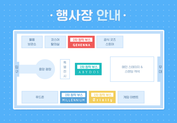 게임 속 학원(학교) 명칭인 게헨나, 트리니티, 아비도스, 밀레니엄 부스에는 각각 25개에서 31개 서클이 관람객을 맞이한다. 한국은 물론, 일본에서 게임을 즐기는 선생님(유저) 창작물을 만날 수 있다. 개인적으로 참여 의사를 밝혔던 일본 유명 작가 방문은 취소됐다.