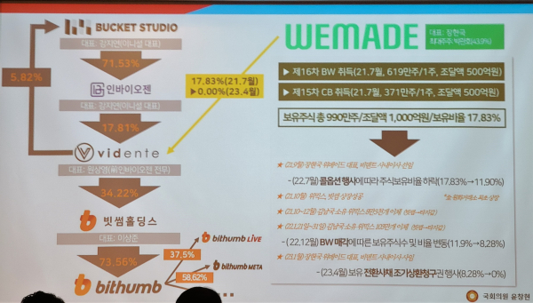 윤창현 의원은 “위메이드가 비덴트에 BW와 CB를 사서 1천억을 투자하며 거래소인 빗썸의 사내이사가 됐는데, 이때가 김남국 의원이 위믹스를 보유한 시기였다. 김 의원의 보유 보고를 받았냐”고 물었고 장 대표는 “김 의원은 전혀 몰랐고 이상거래에 대한 보고도 받지 못했다. 비덴트 투자 이유는 2021년 초 빗썸 매각설이 있었고 거래소가 미래 가능성이 커서 인수전에 참여했다. 직접 투자는 못했지만 비덴트 지분을 인수한 것이다. 비상근이사로 참여했다”고 밝혔다.