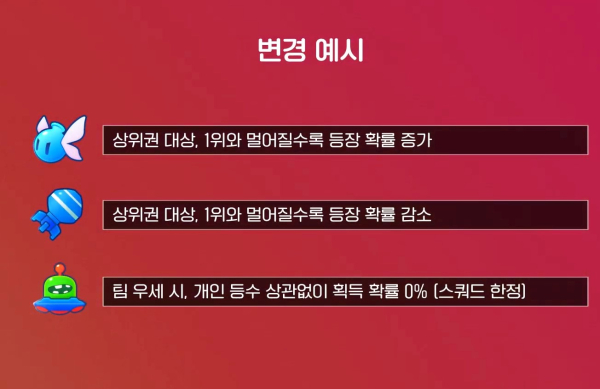 게임 상황에 따라 보다 적합한 아이템을 획득할 수 있도록 아이템 등장 기준이 개선된다. 단순히 순위뿐만 아니라 앞뒤 레이서와의 거리, 스쿼드일 경우 팀의 우-열세 상황에 맞춰 아이템 등장 확률이 달라진다.