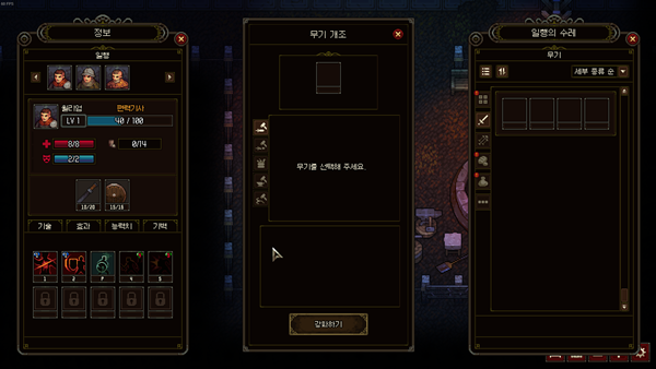 던전을 완료하면 팀원 정비가 가능하다. 음식을 먹고 체력을 보충할 수 있고, 무기를 수리하거나 강화할 수 있다. 던전에서 각종 재료나 아이템을 구해오면 정비할 때 더 많은 선택지가 주어지는 식이다. 캐릭터를 육성하면서 각자의 특성 페이지에서 특성을 조금씩 찍을 수 있다. 이런 정비를 꼼꼼하게 잘 해야 다음 던전을 완료할 수 있는 구조다.