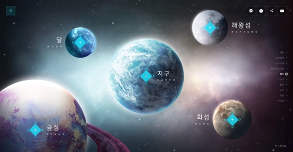 현재 '아레스' 공식 티저 사이트에서는 ’지구’, ‘금성’, ‘달’, ‘화성’ ‘해왕성’까지 총 5개의 월드를 확인할 수 있으며, 각 행성마다 미래 세계관에 어울리는 특별한 이야기를 만나볼 수 있다.