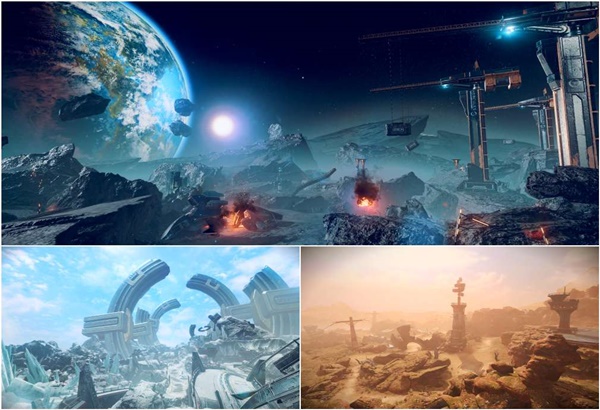'지구’는 과거 대전쟁에서 승리한 '방위군'의 본부로, 넓은 평원 곳곳에 군 기지들이 배치된 것이 특징이다. 또, '금성'은 게임 스토리에서 중요한 역할을 담당하는 종족 '네레이드'가 거주하는 행성으로 남반구 지역인 '엘리아 평원'이 공개됐다. '금성'은 '네레이드'의 여왕 '에일린'의 거처이며, 높은 곳에 위치한 왕궁이 평원을 내려다보는 것이 인상적이다.