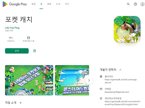 최근 구글 플레이스토어를 통해 ‘포켓 캐치’라는 게임이 출시됐다. 여러 SNS를 통해 광고를 이어갔고, 사랑하는 포켓몬과 함께 떠나는 모험을 게임의 재미로 내세웠다. 게임 제공자는 LAU Yuk Ping인데, 전혀 확인되지 않는 개발자 혹은 개발사로 나타났다.