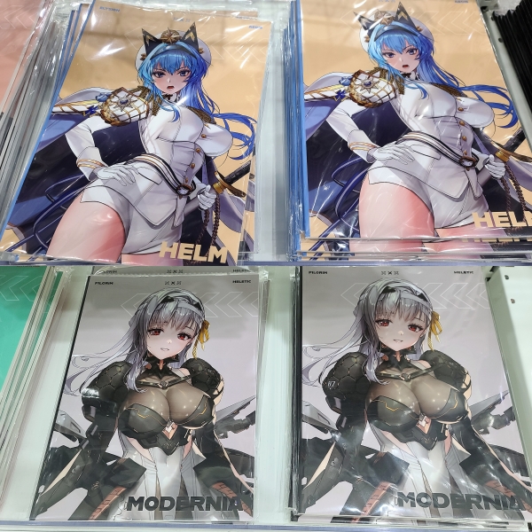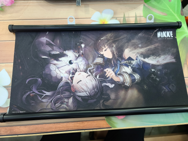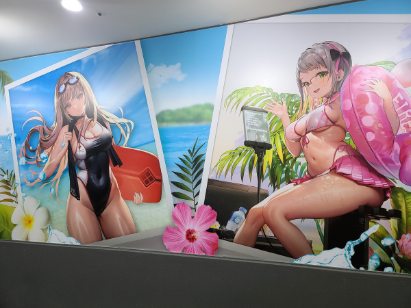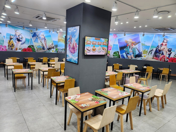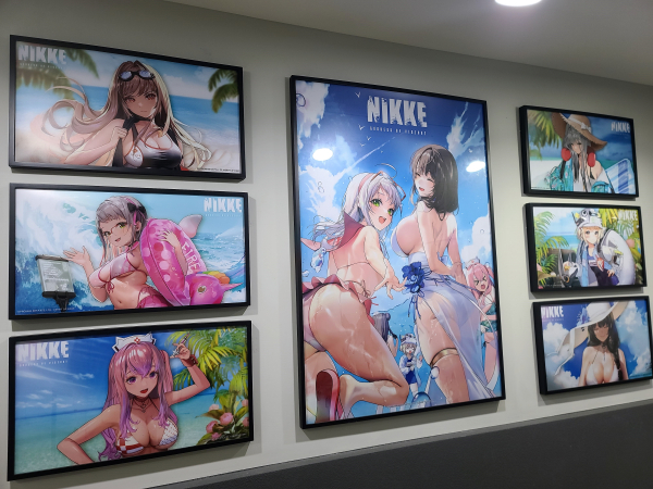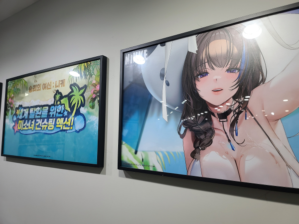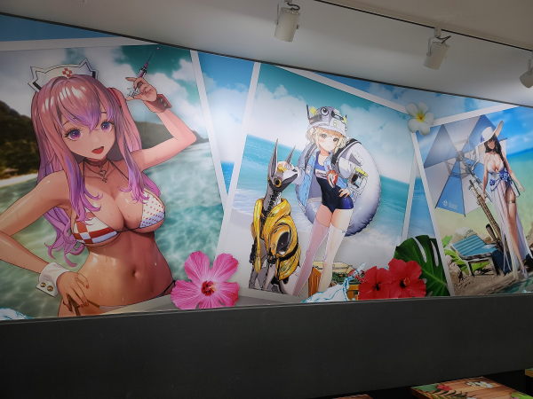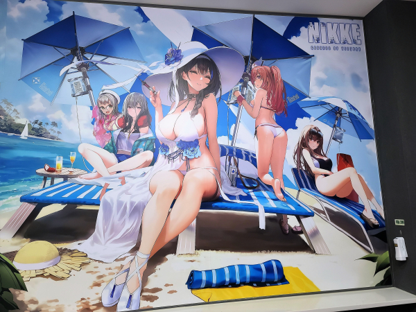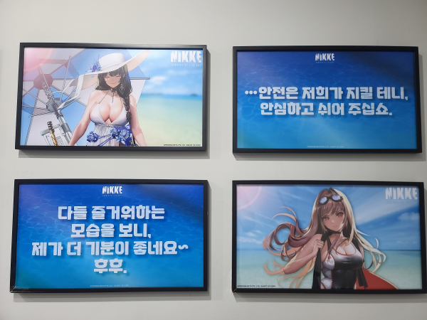 카페에는 넓게 마련된 테이블이 있고, 벽에는 이번 '니케'의 여름 업데이트에 등장하는 캐릭터들의 대형 일러스트가 사진 형태로 구성이 되어 있다. 그래서 카페의 분위기가 전체적으로 시원한 느낌을 준다.