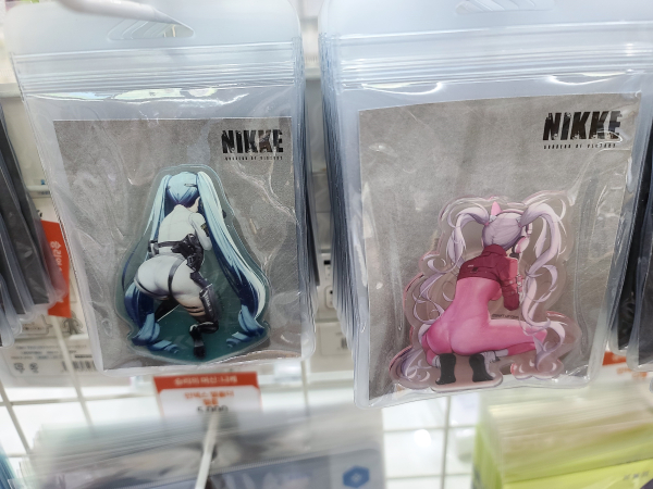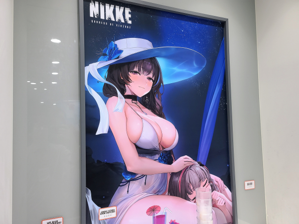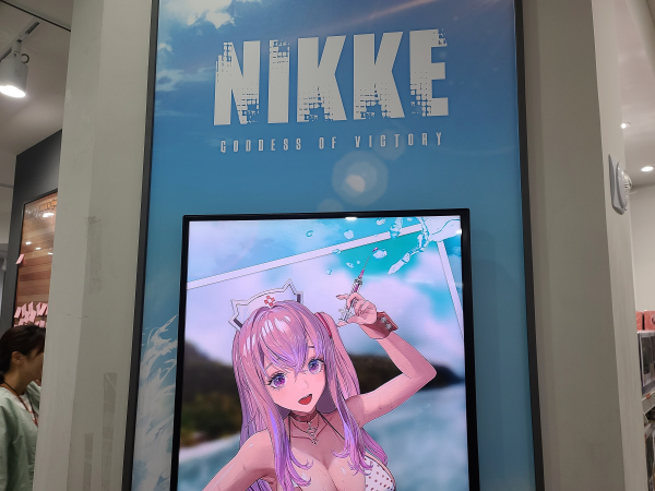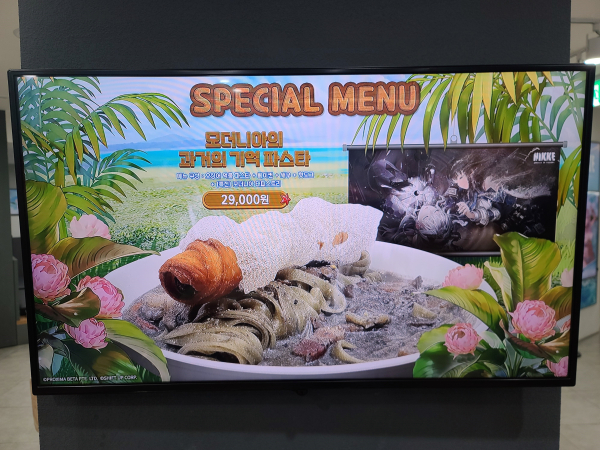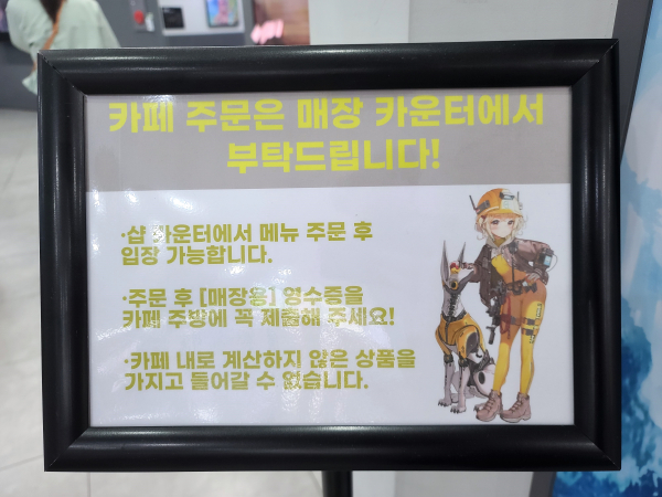 서울에 위치한 애니플러스 합정점 내에 마련된 '니케 카페'의 입구에는 거대한 게임 캐릭터와 함께 카페 주문에 대한 안내와 주의사항이 적혀져 있다.