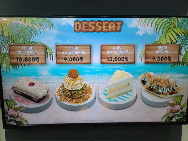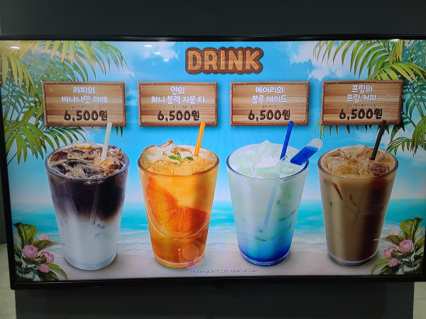 이 카페에서 만나볼 수 있는 메뉴는 음료 4종과 디저트 4종, 그리고 스페셜 메뉴 등 총 9종이다. 각 메뉴마다 캐릭터의 특징이 들어가 있는 것을 확인할 수 있다.