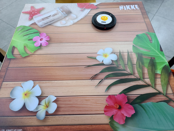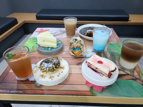 카페의 테이블은 게임 내에 등장한 여름용 목재 테이블의 느낌이 나도록 시트지가 붙어있다. 호출벨 역시 니케로 장식됐으며, 한켠에는 실제로 만들어지는 음식들의 샘플을 확인할 수 있는 공간이 마련됐다.