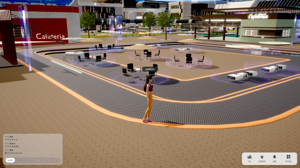 카페테리아는 스몰 토크를 할 수 있는 공간으로 같은 테이블이나 의자에 접근한 사용자만 음성으로 대화할 수 있는 공간이다. 그 공간을 벗어나면 더 이상 대화를 할 수 없었다. 왜냐면 기본적으로 필드 내에서는 소리가 들리지 않는다. 일부 상호작용 존에 입장해야 다른 유저가 내보내는 소리를 들을 수 있기 때문이다.