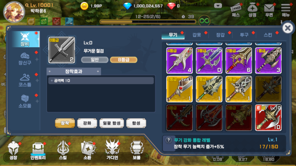 그리고 무기와 방어구, 보물을 소환하는 구조가 있다. 장비는 갑옷과 장갑, 투구, 스킨 등으로 구성됐으며 장신구는 반지와 귀걸이 등 3종이 준비되어 있다. 장비에는 강화와 합성 등 다양한 성장 구조가 있어서 계속 활용이 가능하며, 합성에는 확률이 없어서 꾸준히 모아 성장시킬 수 있다.