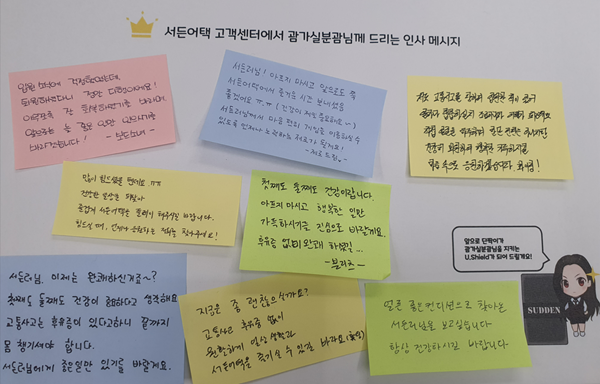 해당 문의에 대해 내부적으로 수령 동의를 완료하기 어려운 상황임을 판단하여 예외적으로 수령동의를 완료할 수 있도록 도움을 드렸구요. 추가로 유저분의 빠른 쾌유를 응원하는 마음을 담아 고객센터 담당자들이 직접 손글씨로 롤링페이퍼를 제작한 사진을 함께 보내 드렸습니다.