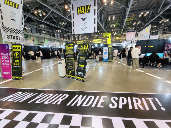 행사장에 입장하면 넓고 쾌적한 모습으로 배치된 인디 게임사들의 부스를 확인할 수 있다. 입구에는 이번 BIC의 슬로건인 'Run Your Indie Spirit’이 새겨져 있다.