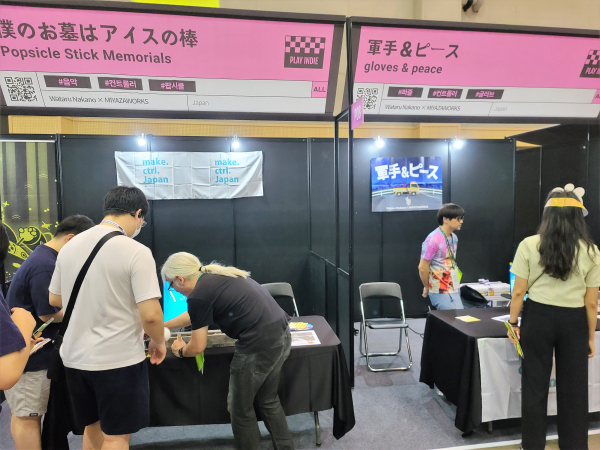이번 행사에는 여러 해외 인디 개발사의 게임도 즐길 수 있었다. 키보드가 아닌 나무 스틱을 꽂아서 즐기는 특이한 형태의 게임도 있었다.