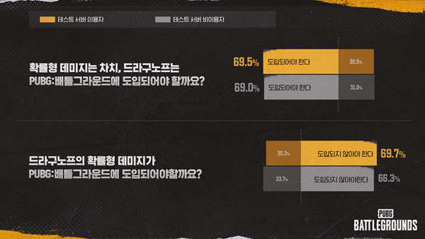 설문조사 결과에 따르면, ‘드라구노프’라는 총기 자체는 추가할 만하지만, ‘확률형 피해’라는 새로운 개념은 도입되지 않아야 한다라는 의견이 대세였다. 특히, 테스트 서버에서 ‘드라구노프’의 확률형 피해를 경험해본 유저들이 더 적극적으로 이를 반대한 것으로 나타났다. 그래서 개발팀은 확률형 피해를 삭제하기로 결정했다.
