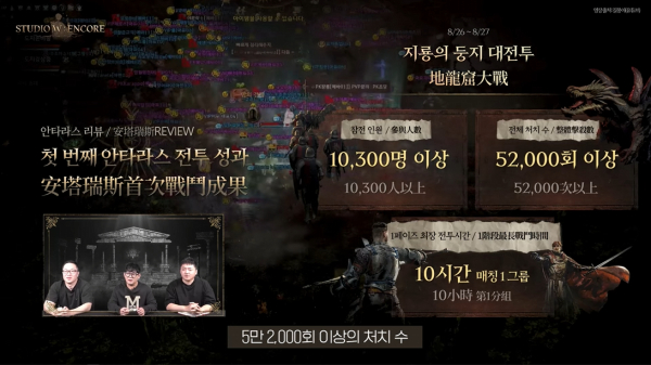 '리니지W'는 지난달 26일부터 27일까지, 지룡 안타라스와 첫 번째 만남이 진행됐다. 첫 전투에는 글로벌 1만 300명 이상의 유저가 참여했다. 전체 처치 수는 5만 2,000회 이상이며, 1페이즈 최장 전투 시간은 10시간이 기록됐다. 시리즈를 상징하는 보스인 만큼, 참여도와 열기가 남달랐다.