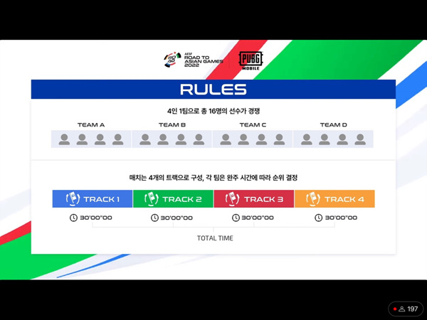 ‘배틀그라운드 모바일’은 배틀로얄이 아니라, 운전과 사격을 병행하는 기록 경기다. 예선은 4개 국가가 한 조가 되어 진행됐다. 아시안 게임 사전 대회에서 좋은 성적을 거둔 한국, 대만, 홍콩은 같은 조에 배정되지 않았다. 한국은 예선 1라운드 C조에서 네팔, 베트남, 몽골을 큰 차이로 제치고 조 1위로 16강에 진출했다. A조에서는 홍콩이, B조에서는 대만이, D조에서는 인도네시아가 조 1위로 16강에 올라갔다.