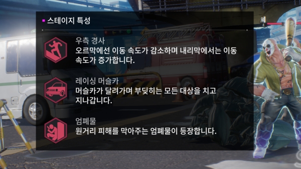 단순한 액션에 변수를 더하는 오브젝트(물체)도 무작위로 등장한다. 적이 타고 오는 자동차, 엄폐물, 경사 등이다. 점프로 적의 등 뒤를 노리는 공략이 필요할 때가 있다. 이런 부분은 대전 액션 보다 벨트스크롤 액션게임에 가깝게 느껴졌다.