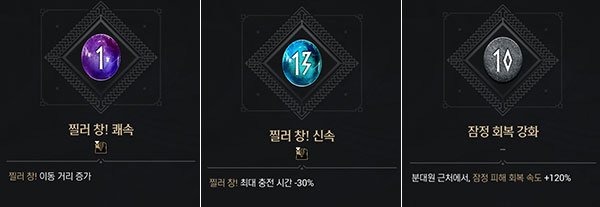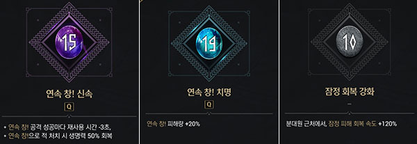 특성은 <연속 창! 신속, 연속 창! 치명, 잠정 회복 강화> 조합의 경우 연속 창의 공격력 상승과 함께 재사용 시간 단축, 처치 시 생명력 회복까지 갖췄다. 연속 창에 특화됐기에 공격 루트는 연속 창으로 가져가는 편이 좋다.