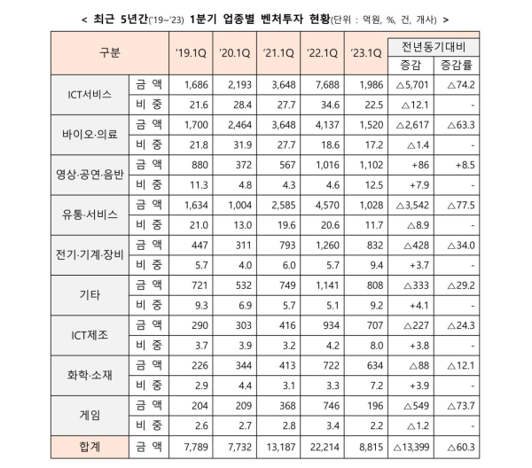 한국 중소벤처기업부가 발표한 올해 1분기 벤처투자 현황에 따르면 게임 부문은 196억 원으로 전년동기 대비 73.7%가 감소했다. 전년보다 투자 금액이 549억 원 감소한 것이다. 그리고 그 금액은 지난 2019년 이후 1분기에 가장 적은 것으로 나타났다.