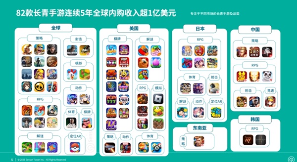 센서타워는 위와 같은 소위 '장수게임'들 중 70% 이상이 미국과 글로벌 시장에 수익을 의존하고 있다고 분석했다.