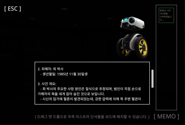사건을 해결하려면 일단 수사봇으로부터 사건 브리핑을 들어야 한다. 여기에는 사건의 장소와 피해자, 사건의 개요, 용의자, 사망 시각 등이 기재되어 있고, 이것을 기반으로 사건 추리를 시작해야 한다.