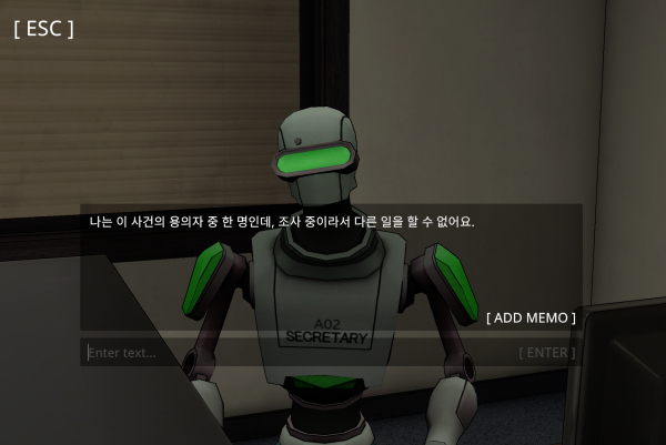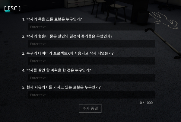 이 게임은 네오 미금의 AI 연구실에서 벌어진 최 박사 살해 사건의 전말을 밝히는 내용으로 구성됐다. 용의자는 AI 안드로이드 4명이며, 모든 단서가 사건 현장에 있는 만큼 현장의 주위를 탐색하며 조사를 진행할 수 있다.
