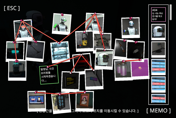 그리고 이렇게 모인 증거들과 정보들은 사진과 핀으로 연결해서, 사건을 쫓는 데 이해가 쉽도록 보드 형태로 구성할 수 있다. 다만 이 기능은 파악을 잘 하기 위한 정보 정리의 수단일 뿐, 연결을 잘 했다고 해서 힌트를 주거나 하는 등의 기능은 없다.