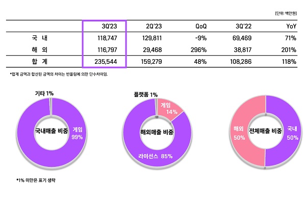 지역별 매출은 국내의 경우 기존 출시 게임들의 매출 자연 감소로 전분기 대비 9% 감소, 전년동기 대비 71% 상승한 1,187억 원을 기록했다. 그리고 해외는 라이선스 계약금 반영으로 전분기 대비 296%, 전년동기 대비 201% 상승한 1,168억 원을 기록했다. 매출 비중은 라이선스가 85%, 게임이 14%를 차지했고, 국내와 해외의 비율은 같았다.